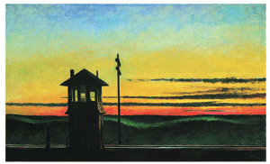 霍普筆下的景物,都泛著濃濃的鄉愁與飄泊的疏離感,只是畫中無生命的景物都有個歸處,沒有所謂「鄉愁」的煩惱。景物的鄉愁感和疏離感,原是出自霍普的觸景生情,而渲染成畫面中的這裡和那裡。