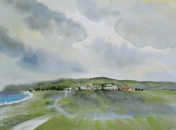 那時寫生的首站,就是花蓮。一大早,我們來到花蓮北濱,清晨的海面是深紫色,有著藍中帶綠的顏色,尤其遠方隱約可見海面不時泛起小白浪花,偌大的海面,顯現生動的變化,與海岸邊的漁村人家,產生一種動與靜之間的協調……。