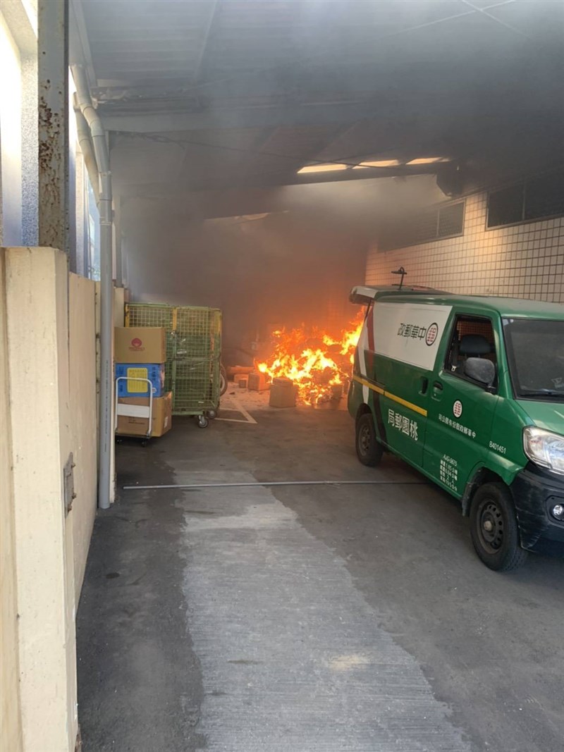 今天上午7時56分許新屋郵局郵務人員在1樓車道旁整理包裹時,突然聽到其中一件包裹發出劈哩啪啦聲響,突然蹦的一聲,瞬間冒出大量濃煙,郵局員工回頭看後,發現起火燃燒,附近居民形容煙衝到好幾十公尺高,聲音像汽車輪攤爆胎聲響。