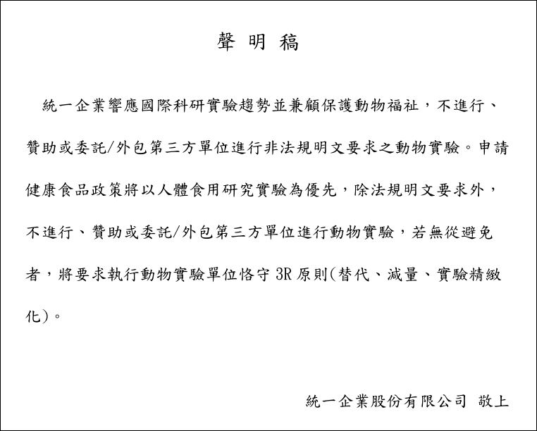 統一等食品業宣布:不再進行非法定動物實驗 |2021.11.17 語音朗讀 1242觀看次 字級 大 中 小 圖/統一企業股份有限公司 【本報台北訊】食品或飲料上的小綠人標章需透過動物或人體實驗證明保健功效,過程極其殘忍,為了證實功效殘害不少小白鼠、倉鼠等動物。近年來動物福利的議題逐漸被國人所重視,從化妝品禁止動物實驗成為常規,現在食品業也加入行動。企業受到國際趨勢與來自動保團體的壓力,以及社會企業責任的實踐,超商龍頭「統一企業」、知名食品大廠「佳格食品」以及太古可口可樂台灣分公司宣布,加入禁止非法定動物實驗的行列。另外養樂多(美國)也向亞洲善待動物組織(PETA)證實,在台灣以益生菌飲料聞名的養樂多有限公司現已正式納入其母公司養樂多本社的最新政策,禁止動物試驗。PETA指出,食品企業為了加強宣稱「健康」功效、向消費者推銷產品,即使是台灣法規並沒有要求必須進行動物實驗的茶類或豆漿等食品,也會對數千隻動物進行實驗。根據農委會2020年度實驗動物人道管理年報,2020年實驗動物的使用量為332萬8902隻,較前一年度的426萬862隻減少約21.9%。另外,2020年共完成8724件動物實驗案件審查,其中「健康食品」則有321件(約3.7%)。「除了保護動物,也保障了消費者不再被未經人體實驗證實的『健康產品』矇騙。」鄭懿馨表示,PETA從去(2020)年8月開始與包含「統一企業」在內的20家食品企業溝通,目前已說服包括佳格食品集團、維他露集團、聯華食品公司、太古可口可樂台灣分公司、以及養樂多股份有限公司等集團在產品製造過程中,禁止非法律規定必要的動物實驗。佳格食品集團:百事可樂旗下桂格燕麥公司授權產銷桂格產品,也是台灣最大的健康食品公司。維他露食品集團:台灣第三大健康食品公司。聯華食品公司:台灣知名零食企業,同時也是台灣7-11便利店的主要供應商。「統一企業」跟進響應 禁止非法定動物實驗行列PETA指出,根據食藥署的官方數據庫顯示,統一企業在2000年至2021年期間,進行或資助了至少17項,實驗過程涉及了917隻動物。現在選擇釋出善意,在10月12日在官方網站發布,除了明文要求的動物實驗外,「響應加入禁止非法定動物實驗行列」聲明,至少有將近千隻動物可終止痛苦的動物實驗。而旗下有「桂格」、「福樂」知名品牌的國內業者「佳格食品」,在今年6月也宣布「除法規明文要求外,不進行、贊助或委託、外包第三方單位進行動物實驗」。食藥署刪除「抗疲勞」實驗 實驗鼠不再游泳、跑步至死 為什麼要做動物實驗呢?根據環境資訊中心報導指出,國人在選購食品時,會以有「小綠人」標章作為考量之一。依據現行健康食品的審查制度,小綠人標章需透過動物或人體實驗證明保健功效。目前衛福部已公告的保健功效項目有13項,包含「護肝」、「免疫調節」、「延緩衰老」、「抗疲勞」、「輔助調節血壓」等等。健康食品抗疲勞功能評估方法中的游泳測試將實驗鼠放入深水中游泳掙扎,直至體力不支而溺死。圖/:擷自PETA官網示意影片其中的「抗疲勞」項目,食藥署今(2021)年4月正式修法,將「健康食品之抗疲勞功能評估方法」修正為「健康食品之抗疲勞保健功效評估方法」,其中重要改革之一就是刪除備受動保團體反彈的「動物實驗」。這項功效須讓動物做「游泳測試」及「跑步機測試」,因為過程殘忍而飽受爭議和批評。宣稱「健康」的代價 台灣現行健康食品法規 亞洲善待動物組織(PETA)科學顧問鄭懿馨博士說明,我國健康食品可分為「安全性試驗」及「功效性試驗」,申請小綠人標章的產品需先經過安全性試驗,PETA目前已成功說服食藥署,優先採用國際認可的非動物實驗方法來進行安全性試驗,來減少對動物殘忍的實驗。功效性試驗方面,按法規大多可讓業者自由選擇動物實驗或人體實驗,只有「延緩衰老」及「護肝」兩項只開放動物實驗,沒有人體實驗的選項。而「抗疲勞」在修法後,目前也剩人體實驗可以操作。「那些食品絕大多數都是平常大家就在吃的東西,沒有道理不能做人體實驗,功效性試驗的部分要禁止動物實驗完全沒有問題。」鄭懿馨說。PETA持續呼籲食藥署在去(2020)年預告新增的「關節保健」功效法規中禁止動物實驗,而鄭懿馨認為,「其他功效也比照修改僅是時間問題。」食藥署表示,是否刪除其它功效的動物實驗,目前都還在研擬當中,也還在跟專家討論,若經評估確認沒有進行動物實驗的必要,後續會持續擴張「不必要動物試驗」的範圍。動物實驗因過程殘忍且實驗動物通常難逃一死,引發許多動保團體反彈。示意圖。圖/亞洲善待動物組織PETAPETA點名愛之味儘快跟上鄭懿馨認為,目前國內對於動物實驗的態度已能在健康食品上看出骨牌效應,除了政府法規與企業政策的改革外,也呼籲大眾抵制這些透過不必要動物實驗製造出的產品,「加速淘汰這些過時的試驗方法。」她也點名「愛之味股份有限公司」,希望國內其他尚未跟進的企業盡快採取行動。 前一篇文章 盜賣逾750萬筆學生個資給補教 每筆10元至20元 下一篇文章 高鐵延伸宜蘭站址 第5折衷地點曝光 熱門新聞 01法全票通過 掠奪文物歸還中國2026.04.1702勞動部將研議 勞退舊制移入新制2026.04.1803【詩】 鐮刀俠2026.04.2104【詩】靜寂 2026.04.1705普門品交響清唱劇妙法之歌 5月12日中山堂首演2026.04.1706補鈣最佳時機 晚餐後或睡前1
