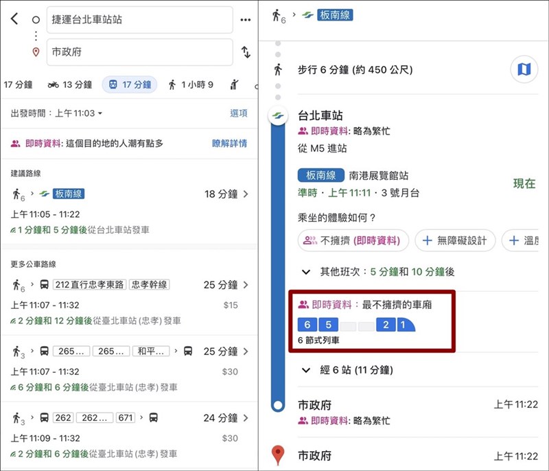 Google地圖新功能 即時顯示北捷板南線擁擠狀況 |2021.11.17 語音朗讀 1354觀看次 字級 大 中 小 Google地圖今在台北推出「車廂擁擠程度預測」功能,成為繼雪梨、紐約後,全球第3個推出此服務的城市。圖/曾原信 【本報台北訊】Google地圖今(17)日在台北推出「車廂擁擠程度預測」功能,成為繼雪梨、紐約後,全球第3個推出此服務的城市。使用者將可以在使用導航時,查看台北捷運板南線即時車廂擁擠程度。Google在官方部落格發文說明,目前這項功能採用的資料由台北捷運提供,會逐步納入更多城市、捷運路線的預測資料,讓通勤族享受更便利的交通導引。車廂擁擠程度預測結果是在人工智慧技術的輔助下,綜合分析Google地圖使用者貢獻的數據,以及用來預測全球各地大眾運輸路線擁擠程度的歷史趨勢所得。圖/截取Google地圖Google強調,所有預測功能都以保障隱私權為最優先考量,Google採用世界級的去識別化技術和差異化隱私技巧來處理定位記錄資料,確保使用者的資料隱私安全無虞。Google地圖今天還公布其他多項新功能,其中「區域繁忙度」功能將整合即時繁忙度趨勢,可以立即查看社區或城市內特定區域的人潮是否開始增加或已經十分擁擠,這項功能將在今年底前開放全球Android及iOS用戶使用。圖/中央社為了幫助使用者在大型建築物內迅速掌握方向,Google地圖將針對世界各地的所有機場、購物中心和交通轉運站,在全球Android和iOS裝置上擴充「商家指南」分頁功能。只要建築物有相關資料可供存取,用戶就能迅速查看建築物周遭的商店類型,例如機場貴賓室、停車場等。此外,Google地圖向Android使用者推出只提供本人查看的全新「時間軸深入分析」分頁,如果選擇開啟「定位記錄」功能,即可在時間軸中看到一個全新分頁,將提供每月的移動趨勢分析,可以查看自己使用的交通方式,包含在開車、搭乘飛機、騎乘單車、步行等的距離和時間。 前一篇文章 高鐵延伸宜蘭站址 第5折衷地點曝光 下一篇文章 AZ混打意願18日上午10時開放 限時6小時登記 熱門新聞 01法全票通過 掠奪文物歸還中國2026.04.1702【詩】 鐮刀俠2026.04.2103勞動部將研議 勞退舊制移入新制2026.04.1804【詩】靜寂 2026.04.1705普門品交響清唱劇妙法之歌 5月12日中山堂首演2026.04.1706補鈣最佳時機 晚餐後或睡前1小時2026.04.1707普門寺愛書人行佛 探討社會議題 2026.04.1808佛光山開山60周年 傳授三壇大戒2026.04.2009南投補助洗冷氣 估減碳排3.3萬噸2026.04.1810用說話鍛鍊大腦2026.04.18 訂閱電子報 台北市 天氣預報 台灣一週天氣預報 相關報導 第18屆兩湖論壇 南投登場總統訪史瓦帝尼 臨時喊卡陸惠台措施 商總:利民就該開放台灣引領轉型AI Google肯定天龍演習 揭密機艙美議員籲立院 通過國防預算