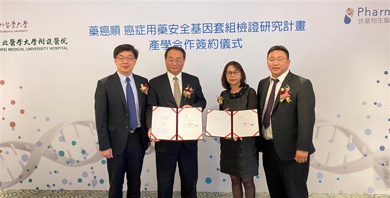 「藥癌順」癌症用藥安全基因套組檢驗研究計畫宣布啟動,由北醫大副校長吳介信(左二)、北醫附醫院長邱仲峯(左ㄧ)與世基生醫詹富慧總經理(右二)、執行董事陳冠志(右一)進行換約儀式。圖/北醫附醫