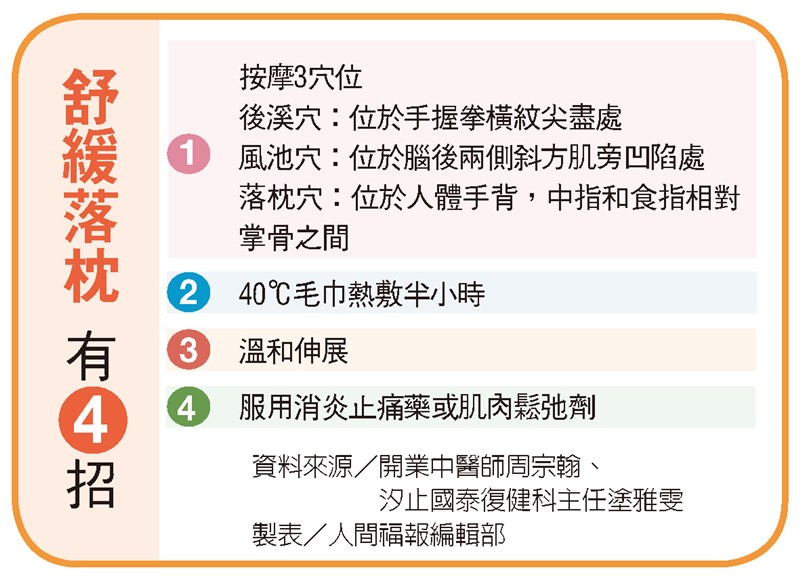 她指出,其實依據落枕的原因不同,治療方式也會不一樣,若是因肌肉緊繃引起的落枕,可以用攝氏四十度毛巾熱敷半小時,並搭配伸展,讓肌肉放鬆,急性發炎則可搭配使用消炎止痛藥以及肌肉鬆弛劑,稍微緩解症狀。