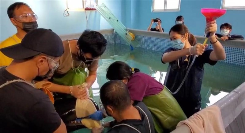 17日宜蘭蘇澳罕見活體偽虎鯨擱淺,傳來救援好消息,插管補水開始餵食。圖/蔡馥嚀提供