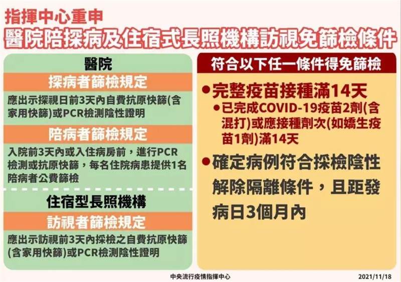 至於未符合條件者,在進入醫院場所探病者,必須出示探親前3日陰性快篩證明或PCR證明,若屬陪病者在入院前3日或入住病房前,進行PCR篩檢或抗原快篩檢測,每名住院病患提供一名陪病者可進行公費篩檢。