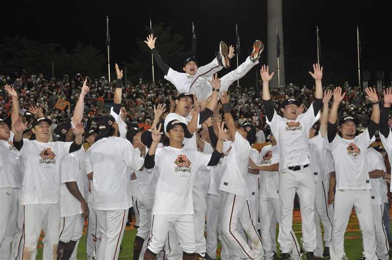 獅隊總教練林岳平(上)賽後被球員拋起慶祝拿到下半季冠軍。圖/記者張哲郢