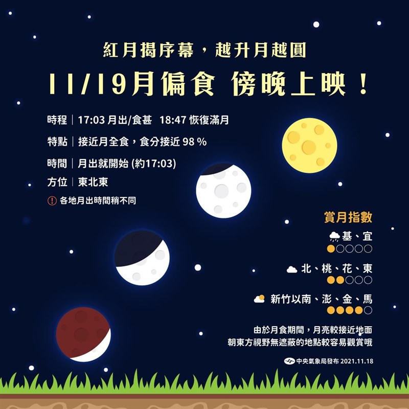 氣象局說,今天台灣各地的月出時刻約在今天下午5時2分至17分間,因此「半影食始」及「初虧」階段尚未月出無法見到。月出後可見到「食甚」後月面逐漸恢復的偏食過程。