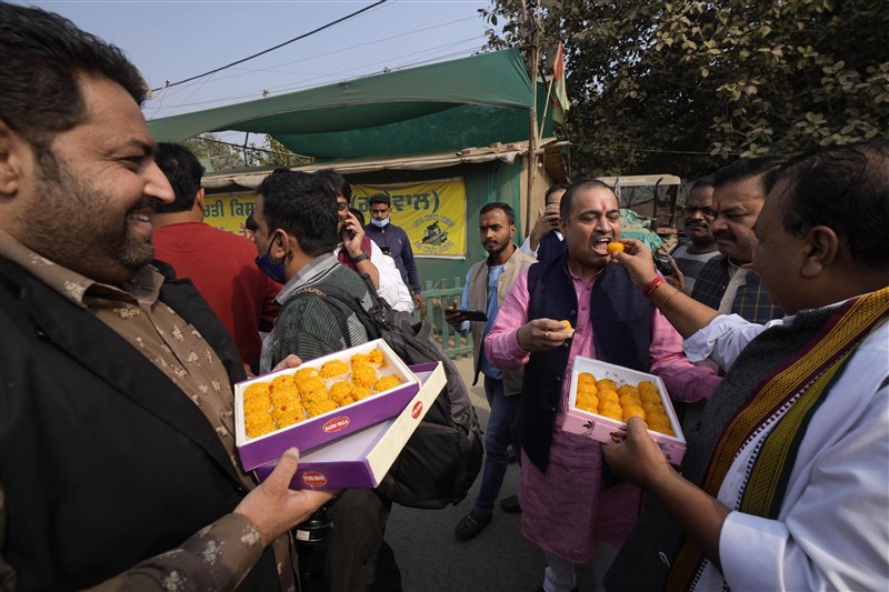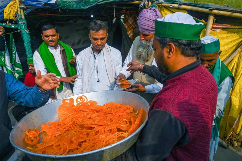 莫迪宣布廢除三條農業法後,北方邦加茲阿巴德市農民在街頭分送甜點慶祝。圖╱美聯社