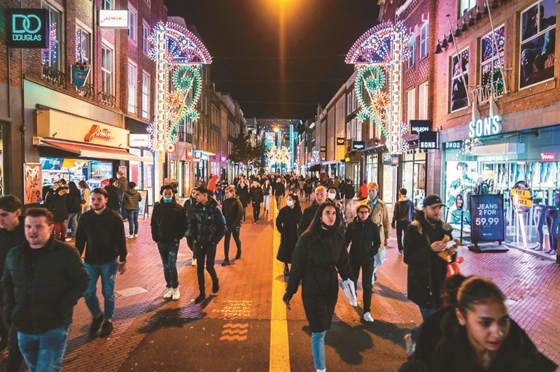 荷蘭總理呂特12日宣布,縮短酒吧、餐廳和商店營業時間。圖為荷蘭恩荷芬民眾晚間在街頭走動。圖/法新社