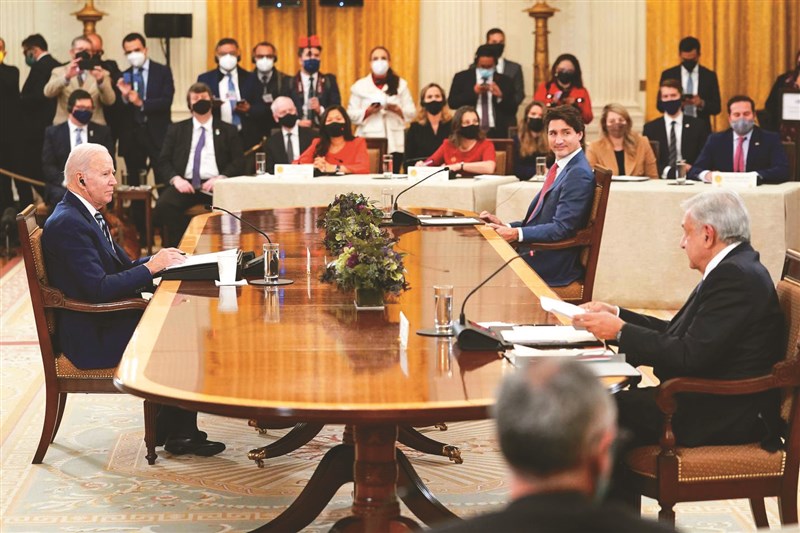 美國總統拜登(左)、加拿大總理杜魯多(右二)及墨西哥總統羅培茲(右),十八日在白宮舉行北美峰會,這是北美三國領導人近五年來首度舉行峰會。圖/美聯社