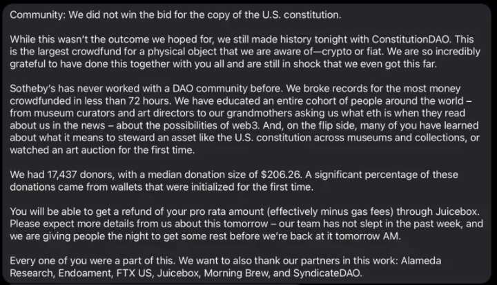 1787年美國憲法初版 逾12億天價落槌 |2021.11.20 語音朗讀 959觀看次 字級 大 中 小 極為罕見的1787年美國憲法初版印刷本。圖╱美聯社 【本報綜合外電報導】極為罕見的1787年美國憲法初版印刷本,美東時間18日以4320萬美元(約新台幣12億960萬元)敲槌賣出,創歷史文件拍賣最高價紀錄。蘇富比拍賣行(Sotheby's)表示,有個加密貨幣投資人團體集資4000萬美元要買下這份文件,但最後未成功投得。目前世界所知美國憲法初版印刷本僅存13份,其中只有兩份由私人擁有,這是其中一份。1787年,美國開國元勛華盛頓(George Washington)、富蘭克林(Benjamin Franklin)和麥迪遜(James Madison)等人於費城獨立廳召開制憲會議,簽署美國憲法。文件原本屬於已故紐約地產發展商戈德曼(S. Howard Goldman),他於1988年以16.5萬美元投得。最初文件估計拍賣價格為1500至2000萬美元,但最終成交價高出兩倍多。極為罕見的1787年美國憲法初版印刷本。圖╱美聯社一個加密貨幣投資人集合1萬7437人,集資4000萬美元競投美國憲法初版,最後未能成功。拍賣會得標的買主是對沖基金城堡投資集團(Citadel)創辦人格里芬(Kenneth Griffin)。他宣布將借出文件給一間位於阿肯色州本頓維爾的藝術博物館展出。蘇富比發言人表示,拍賣成交價為4100萬美元,連同必需費用實際價格為4320萬美元。收益將撥歸戈德曼遺孀的基金會。1萬7437人集資競投美國憲法初版,但未成功。圖╱取自推特 前一篇文章 美國CDC授權開放 成人接種第三劑疫苗 下一篇文章 拜登接受例行性健檢 賀錦麗暫掌總統權創歷史 熱門新聞 01【獻給動物朋友的詩】站成蘭花的螳螂與嘗到幸福滋味的蜂2026.01.2902【傳燈六十‧百年仰望】星雲大師一筆字書法紀念特展概述2026.01.3003澳網 辛納拚3連霸 小蠻牛盼全滿貫2026.01.3004曼谷文教中心 傳遞佛陀慈悲2026.01.2905芝加哥禪淨中心 臘八粥饗眾2026.01.2906【詩】我的母親不是個詩人2026.01.2907【紀實攝影】花蓮月光寺 台灣後山的人間淨土2026.02.0108AI加速自動化 亞馬遜全球裁員 3 萬人 2026.01.2909佛光山大雄寶殿 逾千僧信迎萬佛2026.02.0110土方之亂推高成本 房價漲壓浮現2026.02.02 訂閱電子報 台北市 天氣預報 台灣一週天氣預報 相關報導 哥斯大黎加總統大選 右翼壓倒勝多倫多絕美天際張又俠被查 解放軍報:清除絆腳石陸春運 添科技味廢除ICE美俄限武條約到期 核競賽恐重啟