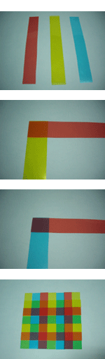 先準備藍色、紅色和黃色的透明塑膠紙,剪出寬度一樣的長條(圖