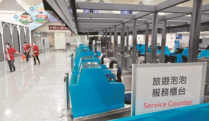 第二航廈內為旅遊泡泡設置的報到櫃台空蕩蕩,只有清潔人員定時前往消毒。