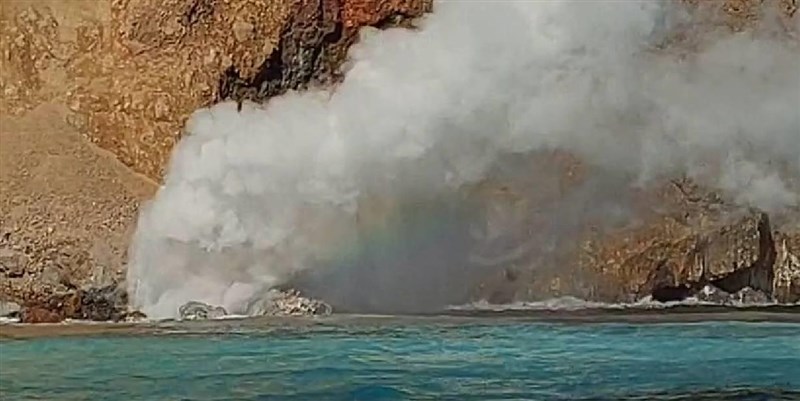 宜蘭龜山島再度發生磺煙大噴發,煙下方還出現彩虹。圖/簡逢均提供