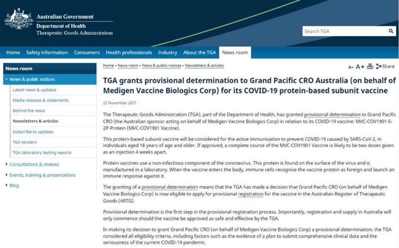 【本報綜合報導】據澳洲藥品管理局(Therapeutic Goods Administration,TGA)的最新聲明,高端疫苗已經取得澳洲臨時許可(Provisional Determination),可以進一步申請新冠疫苗「緊急授權」(EUA)。