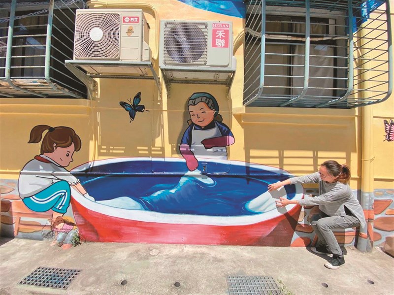 汙水接管的空間,串起了古今新莊成德里發展軌跡,圖為民眾和彩繪作品合影。圖/新北水利局提供