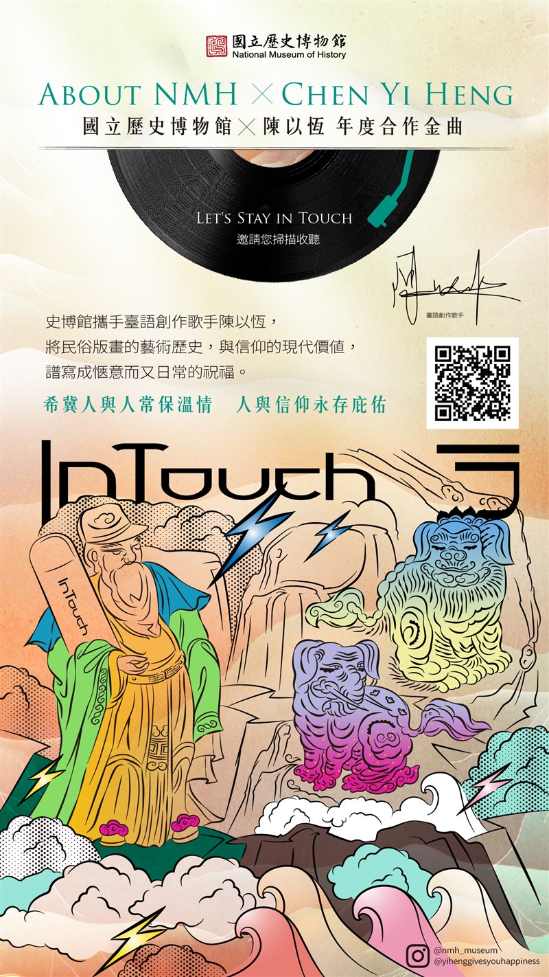 史博館指出,陳以恆以日常又有點幽默的手法創作專案「眾神潮 In touch」的同名主題曲〈In Touch〉,並運用館藏〈文官門神(白象)〉、〈文官門神(青獅)〉轉化繪製成為現代版畫意象的專輯封面。