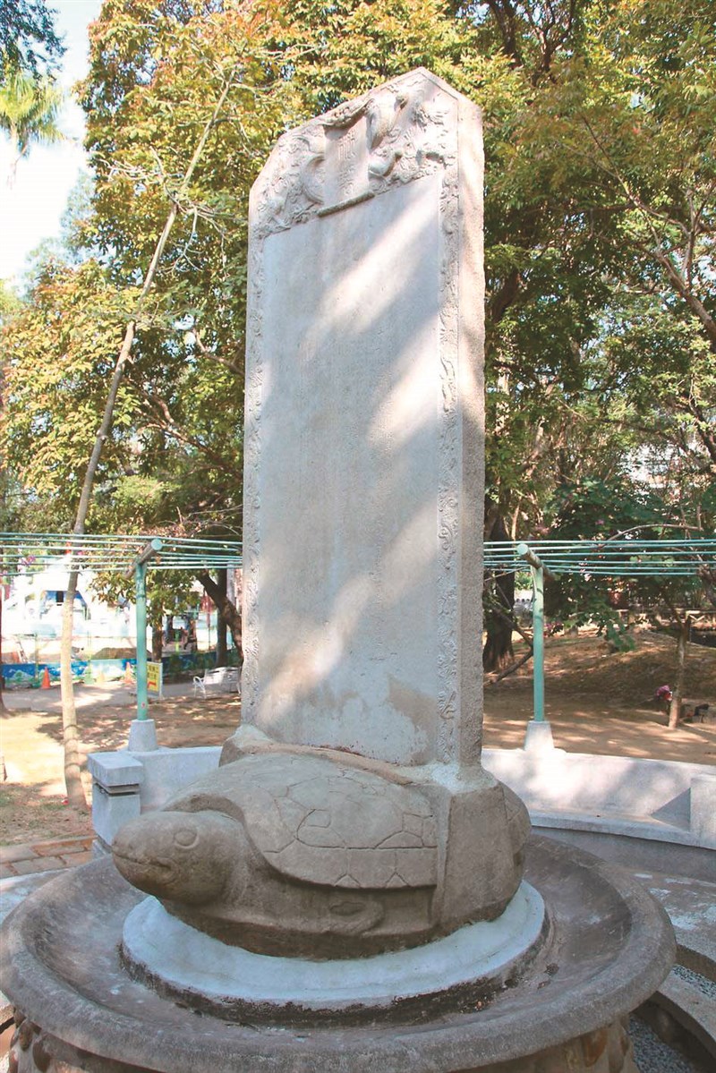 嘉義公園內的「清高宗敕建福康安等功臣生祠碑記」,基座以贔屭馱負,材質與花崗岩石碑明顯不同。圖/記者江俊亮