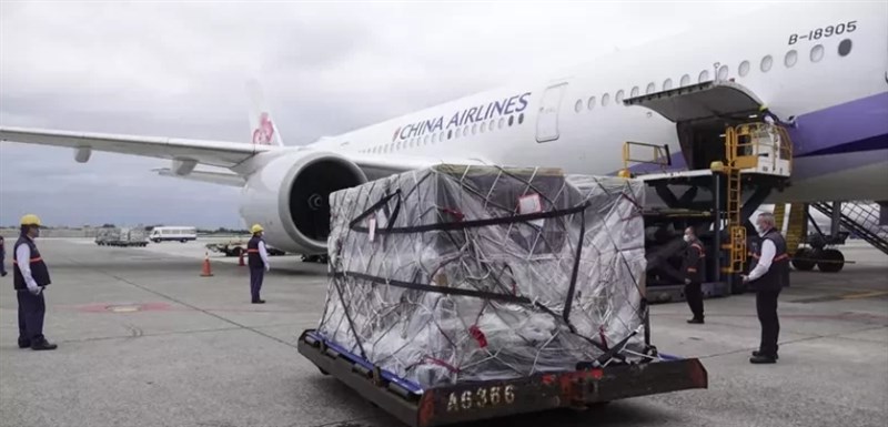 由永齡基金會/鴻海、台積電和慈濟共同購買的1500萬劑輝瑞BNT疫苗,第13批由中華航空CI-62班機從德國法蘭克福以客機載貨方式運送,於25日清晨6時16分運抵桃園機場。班機降落滑行進入A7停機坪,桃園航勤公司裝卸組地勤人員將裝著冷凍貨櫃的3個疫苗貨盤卸下,海關至機坪完成機邊驗放通關程序,疫苗直接運送至指定冷儲物流中心進行後續檢驗封緘作業,提供新冠接種計畫所列實施對象接種。
