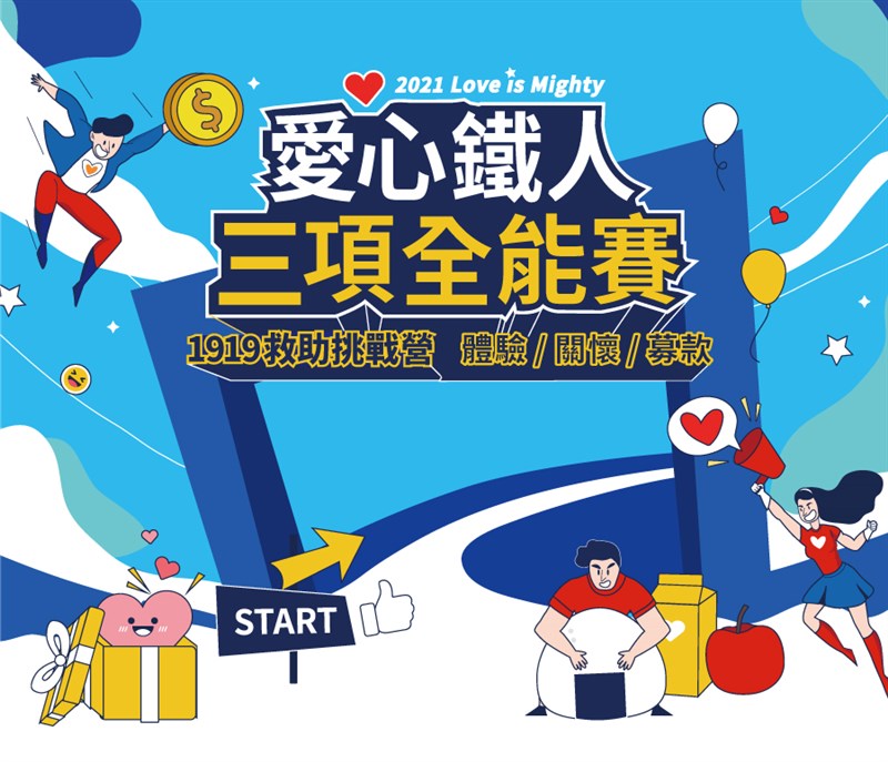 基督教救助協會為籌募急難救助金而發起的「1919救助挑戰營」已經連續15年,今年因為疫情首度改為虛、實合體的「愛心鐵人三項全能賽」,只要三人就可成隊,在2022年1月14日以前挑戰用100元省吃儉用過一天,並透過社群平台傳遞對急難家庭的關懷,以及募得1919元,就能獲得完賽證書,愈快完成禮物就愈豐厚。