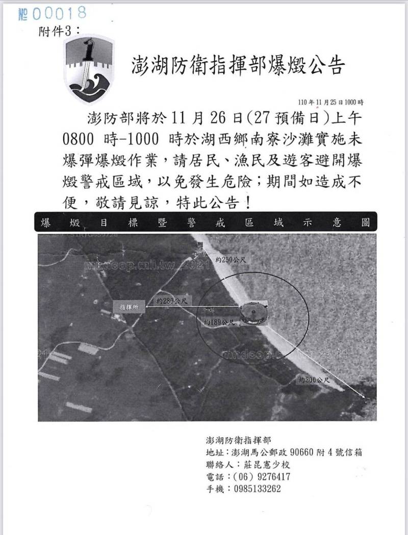 澎湖發現未爆水雷 明進行爆毀作業 |2021.11.25 語音朗讀 883觀看次 字級 大 中 小 澎湖北寮海際日前發現未爆水雷,明天將進行爆毀作業。圖/澎防部提供 【本報台北訊】澎湖北寮海際日前發現一顆未爆水雷,陸軍澎防部今(25)日表示,將於明日上午實施現地爆毀作業。陸軍澎湖防衛指揮部表示,日前接獲北寮安檢所通報,於該所附近海灘發現疑似未爆彈。經未爆彈處理小組鑑定為「早年遺留水雷」1顆,彈體重鏽,料、批號不明。因雷體完整,考量危安,現場即由海巡人員封鎖。澎防部指出,今日已邀請相關單位召開協調會,決議於明(26)日上午8時至10時實施現地爆毀作業,並已事先完成公告,呼籲民眾遠離爆毀警戒區域,避免發生危安。圖/澎防部提供圖/澎防部提供 前一篇文章 中國大陸推行自動駕駛計程車 首個商業試點設北京 下一篇文章 101「雙跨年」活動登場 煙火有望超過300秒 熱門新聞 01【讓愛自由】纏繞與獨立之間2026.04.0202新生首次到校2026.04.0203星雲大師靈骨分燈泰國 化益世人2026.04.0204打字機重返課堂 對抗AI代寫2026.04.0205租賃車業者違法攬客 觀光署:最高罰200萬元2026.04.0706緬甸佛學院訪佛光山 深化教育弘法發展2026.04.0207日月潭蓄水率 跌破6成2026.04.0208睡足多運動常吃蔬菜 改善生活習慣促健康2026.04.0209徐若熙日職初登板 6局6K奪首勝2026.04.0210奧斯陸佛光童軍 體驗禪修學滑雪2026.04.02 訂閱電子報 台北市 天氣預報 台灣一週天氣預報 相關報導 流蘇花 已盛開九九峰園區氦氣球 賞高空美景浪漫那瑪夏 賞螢採果樂降雨兩樣情 南部水庫沒解渴玉山4月雪拳擊亞錦賽 陳念琴保底銅牌 桌球世界盃 林昀儒暌違7年闖4強