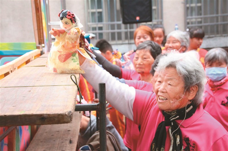 九十歲的許金葉(前),是朴子「仁醫」吳杯初的外甥女,首次演出掌中戲。