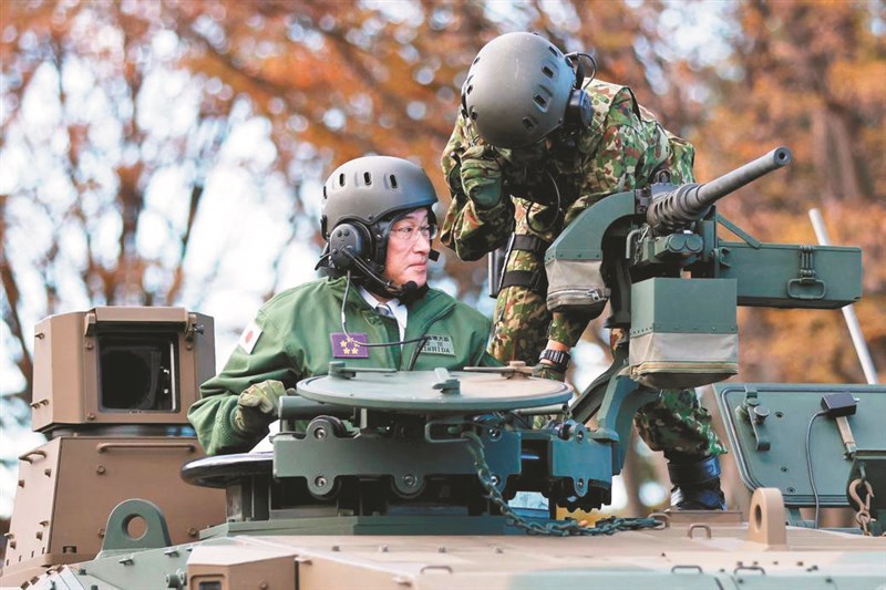 日本首相岸田文雄二十七日出席陸上自衛隊朝霞基地閱兵儀式,並試乘裝甲車和坦克。圖/法新社