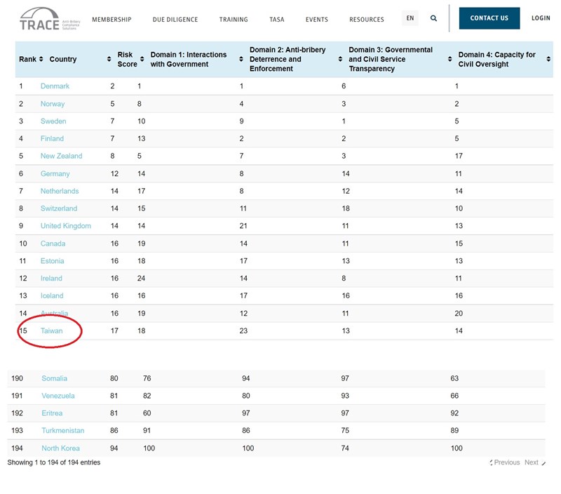 台灣賄賂風險指數為亞洲最低,高居世界第15名。圖/擷取自TRACE官網