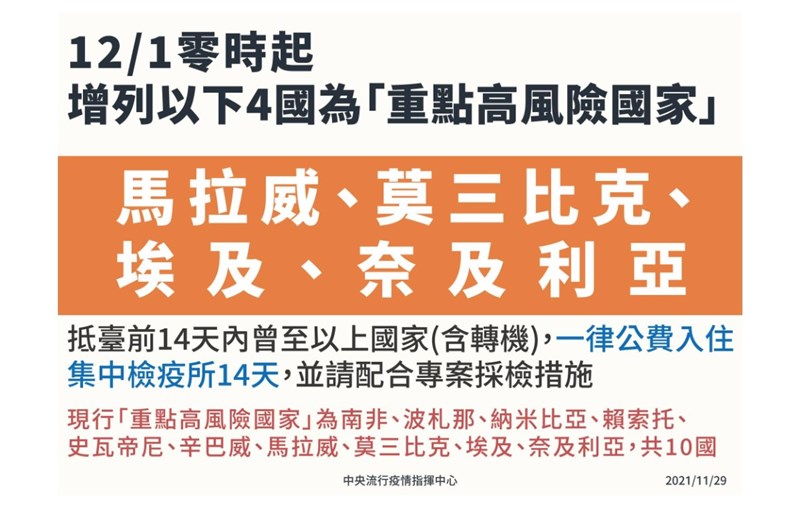陳時中今天則宣布,考量馬拉威、莫三比克、埃及、奈及利亞等四國已有個案輸入他國,且評估其國內疫情有擴散趨勢,研判風險較高,自12月1日零時起,增列為「重點高風險國家」。