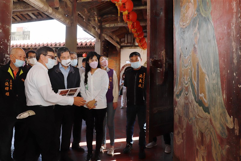 文化部長李永得(中)今(29)實地瞭解國定古蹟鹿港龍山寺修復情況及歷程。圖/文化部提供