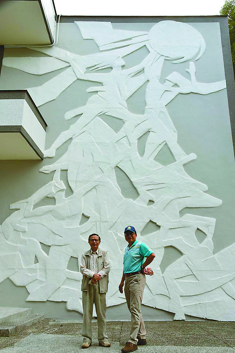 校方保留四十五年前師生完成的巨型浮雕,當年創作的老師方建明(左)看了很感動。圖/屏東大學提供