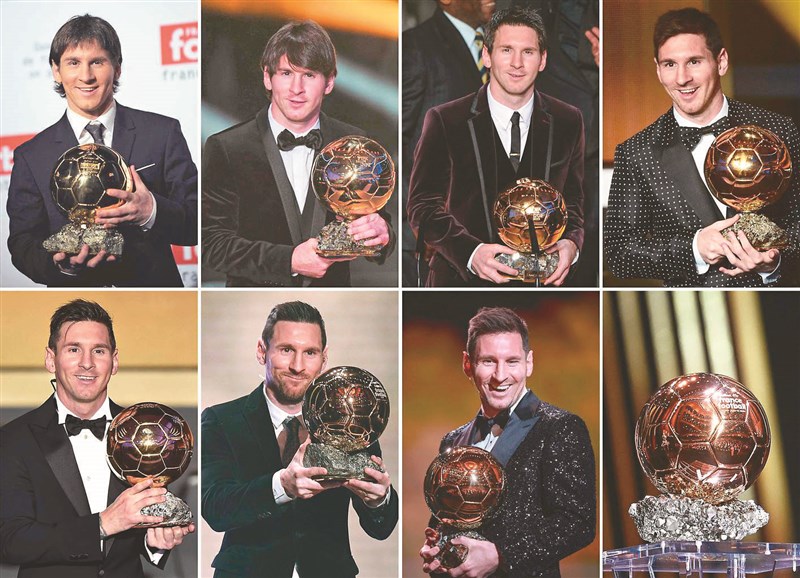 從2009、2010、2011、2012、2015、2019到今年(左上至右下),梅西7度獲頒金球獎的歷史性畫面。圖/法新社