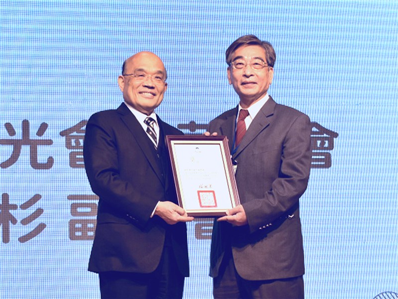 國際佛光會中華總會副總會長吳欽杉(右)代表接下行政院長蘇貞昌的表揚。圖/記者李祖翔