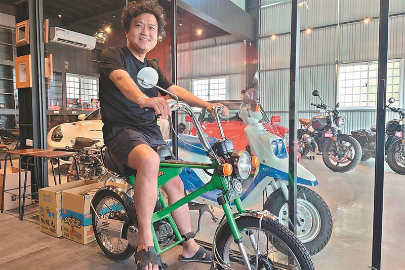 他說,收藏品中有雙人短座墊、車尾略高的小型速克達,車身雖小但馬力十足;還有一輛配備擋風玻璃和車頂的三輪機車,「前一後二」的輪胎設計,後座是平穩的置物空間,是早年日本都會區很受歡迎的送貨商用車,有人暱稱為「拉麵車」。