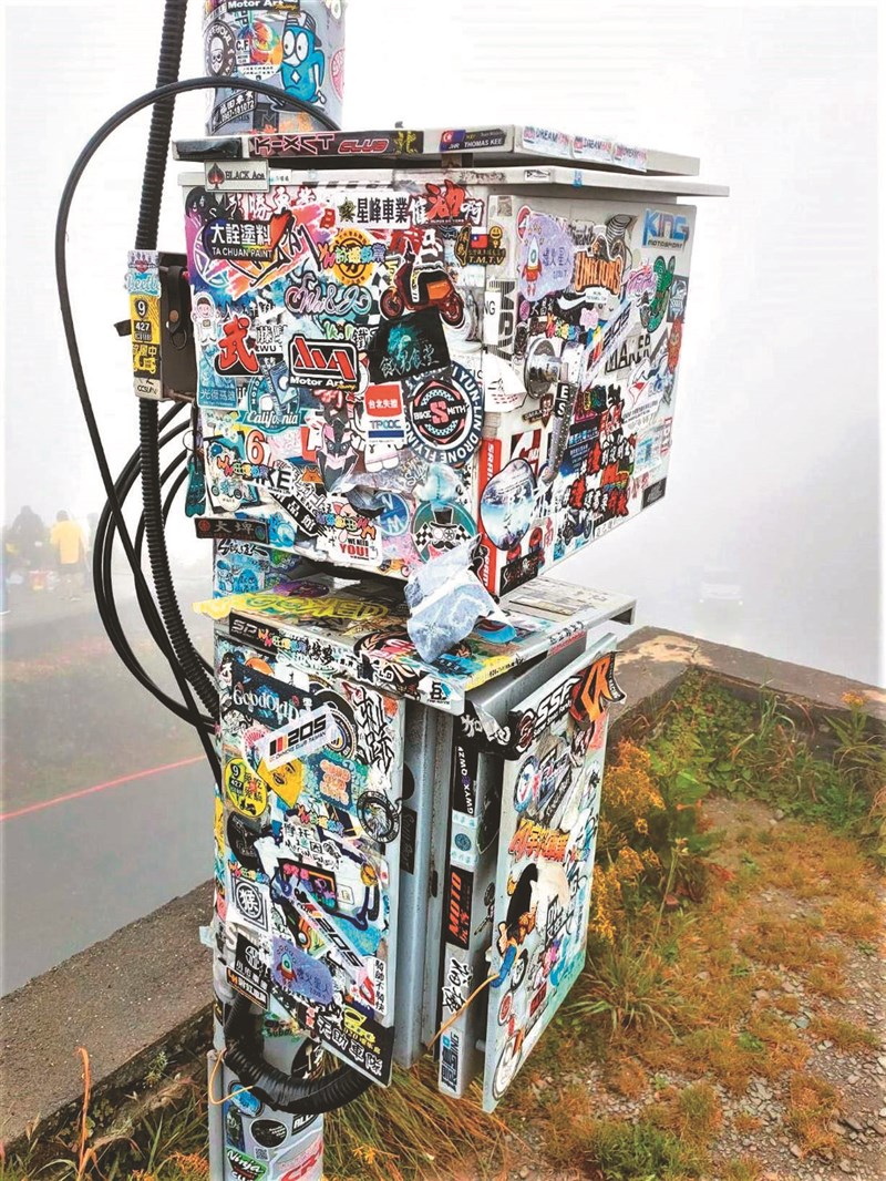 【本報南投訊】合歡山不分四季,遊客眾多,民眾上山前多利用即時影像確認當地狀況,武嶺亭的監視器最常被監看,有沒公德心的遊客將車隊、社團、公司等貼紙貼上監視器桿子、電箱,甚至桿頂鏡頭,象徵「到此一遊」,桿身貼得密密麻麻、顏色混雜,被網友稱是「最丟臉風景」。
