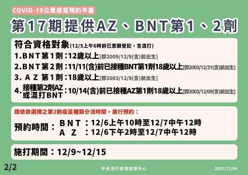 預約平台第17期規畫提供BNT疫苗及AZ疫苗預約,相關對象及期程說明如下: