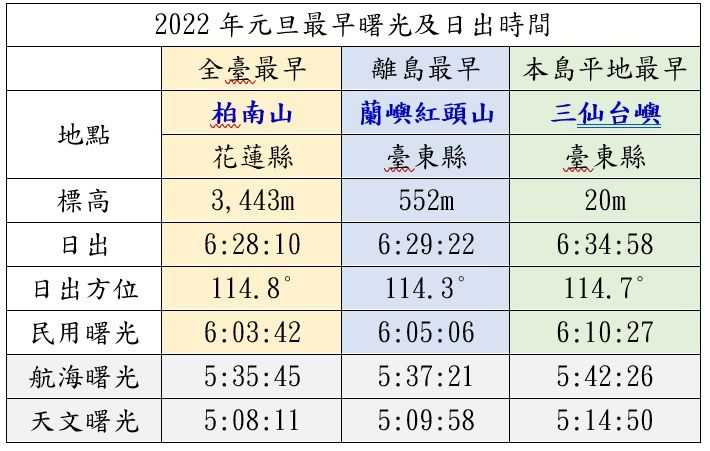 【本報台北訊】2022年即將到來,台北市天文館製作2022元旦曙光及日出地圖,提供民眾按圖索驥。全台最早現曙光地點為花蓮縣柏南山、本島平地最早為台東三仙台、離島為蘭嶼紅頭山。