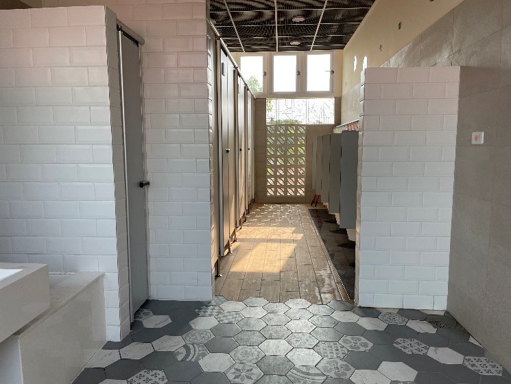 雲林縣林內國小利用整修外部牆面加大開口改採花格磚配置,引進南北照形成自然日光室的效果,打造簡潔明亮的空間品質,打破原有單調色彩,塑造自然活潑的廁所空間;台東縣綠島國小,規劃色彩豐富的隔間設計,以及入口處海洋磁磚,結合當地海洋元素,配合學校課程發展,展現綠島海洋綠地與自然生物和諧共處一面。
