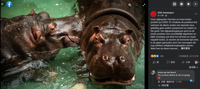 據媒體報導,比利時安特衛普動物園(Antwerp Zoo)住著一對41歲與14歲的河馬母女Hermien 和 Iman,傳出染疫後管理員已將牠們隔離。