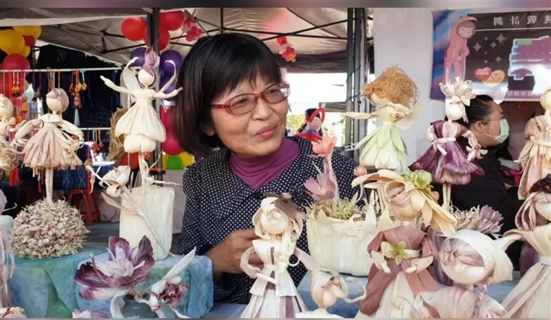 魏麗環說,一般人吃完玉米都直接將玉米苞葉丟棄,但玉米苞葉可以製作出很多可愛的花朵、娃娃,特別是材料環保、易取得,只要曬乾就能創作,配合植物染還能有更多顏色搭配。