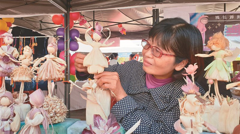 魏麗環用廢棄玉米笣葉製作〈玉米精靈〉作品,精緻又富有童趣。圖/李宗祐
