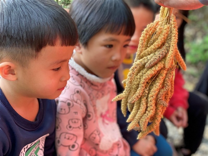 幼兒觀察並觸摸trakis(小米),讓幼兒五感探索,說出體驗的感覺。圖/教育部提供