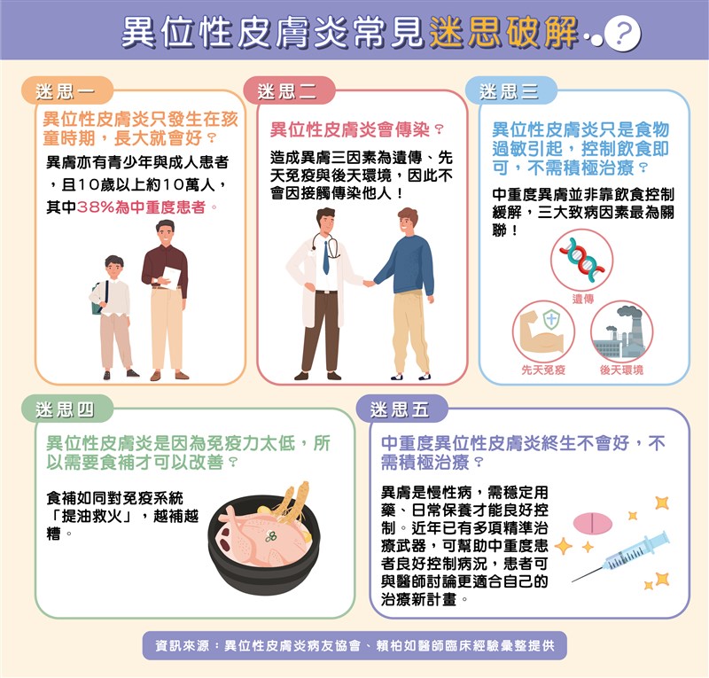 異位性皮膚炎病友協會,也發布「國人常見五大異膚迷思」,包括「異膚會傳染」、「異膚是孩童專屬」、「避免飲食過敏就好,不需積極治療」、「異膚需多加進補」等錯誤觀念,呼籲國人正確認識這個惱人的疾病。