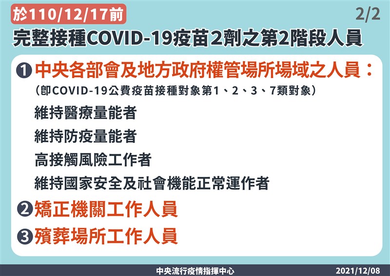 第1至3類、7類快接種2劑 明年元旦新制上路 |2021.12.08 語音朗讀 1033觀看次 字級 大 中 小 板橋大遠百機動疫苗接種站啟動。圖╱中央社 【本報台北訊】中央流行疫情指揮中心今日表示,因應國際疫情和Omicron新型變異株威脅,明年元旦起包含中央政府等場域、醫護人員、高風險人員等,共第一、二、三、七類對象,還有矯正機關及殯葬工作者都要接種滿二劑疫苗。副指揮官陳宗彥表示,關於舉列人員,因會常常接觸不特定對象,希望完成接種兩劑疫苗滿14天,或是成為確診個案者,應保持3個月內衛生主管機關解除隔離書,得以暫免施打,或醫師有證明不適合接種證明等,若兩者皆無,務必明年元旦起前完成兩劑接種。指揮中心說,為確保相關場所場域人員自111年1月1日起皆能符合上開規範,各相關部會及地方政府將加強督導,請相關場所場域鼓勵未完整新冠疫苗接種之工作人員及從業人員,盡速於12月17日前完整接種2劑疫苗。明年元旦起第一、二、三、七類對象,還有矯正機關及殯葬工作者都要接種滿二劑疫苗。圖/指揮中心提供 前一篇文章 登玉山突中風 3人輪流背8.5公里 山友撿回一命 下一篇文章 指揮中心4不原則 籲8.3萬逾期停居留者安心打疫苗 熱門新聞 01【詩】 鐮刀俠2026.04.2102勞動部將研議 勞退舊制移入新制2026.04.1803普門寺愛書人行佛 探討社會議題 2026.04.1804佛光山開山60周年 傳授三壇大戒2026.04.2005南投補助洗冷氣 估減碳排3.3萬噸2026.04.1806用說話鍛鍊大腦2026.04.18072026地球日 行動永續綠色未來 2026.04.2208氣候變遷 牽動美年輕人生育觀2026.04.1909永和學舍慶佛誕 千人浴佛清淨身心2026.04.2210【營養專欄】外食族必學:補菜四策略2026.04.18 訂閱電子報 台北市 天氣預報 台灣一週天氣預報 相關報導 鏟子超人公仔 見證最暖身影穩定物價 補貼小黃加油錢每輛6千具觀光發展潛力 大溪中庄休閒農業區金門祕境海堤士林官邸金針花 顛覆想像桃園野生動物救傷中心 啟用