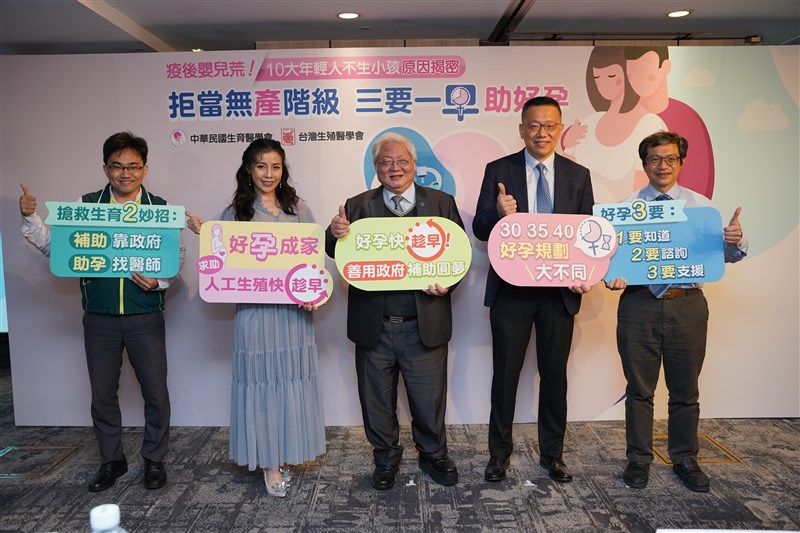 左起國健署科長麥揚竣、好孕成家宣導大使邱韻文、國健署長吳昭軍、中華民國生育醫學會理事長張帆、台灣生殖醫學會秘書長何信頤。圖/中華民國生育醫學