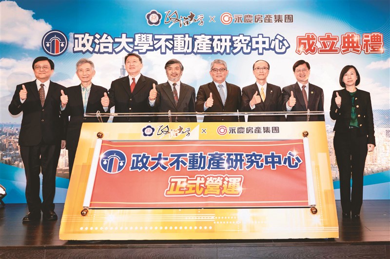 「政治大學不動產研究中心」昨在內政部政務次長花敬群(右四)見證下,由捐助機構永慶房產集團董事長孫慶餘(右三)與政治大學校長郭明政(左四)共同宣布正式成立。圖/永慶房產集團提供