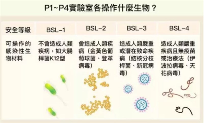據科普媒體「研之有物」指出,生物實驗室分成四個等級「P1~P4」,數字愈大等級的實驗室要操作的病菌就更凶險。其中P1是最單純,規格就像大學實驗室差不多,而P2是另外加上一個生物安全櫃,有些較危險的實驗樣品都得在裡面進行。