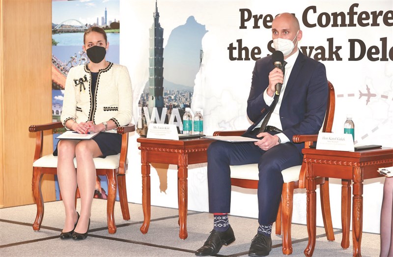 斯洛伐克代表團舉行訪台記者會,斯洛伐克經濟部政務次長葛力克(右)、外交部經濟合作總司長季絲(左)接受媒體提問。葛力克表示,他的角色主要是引領企業團訪台,深化台斯經濟合作,「任何人都不能阻撓經濟合作」,且台、斯為志同道合夥伴,希望在半導體、電動車、太空產業、智慧城市等領域增進合作,也希望針對半導體成立工作小組。圖/林俊良