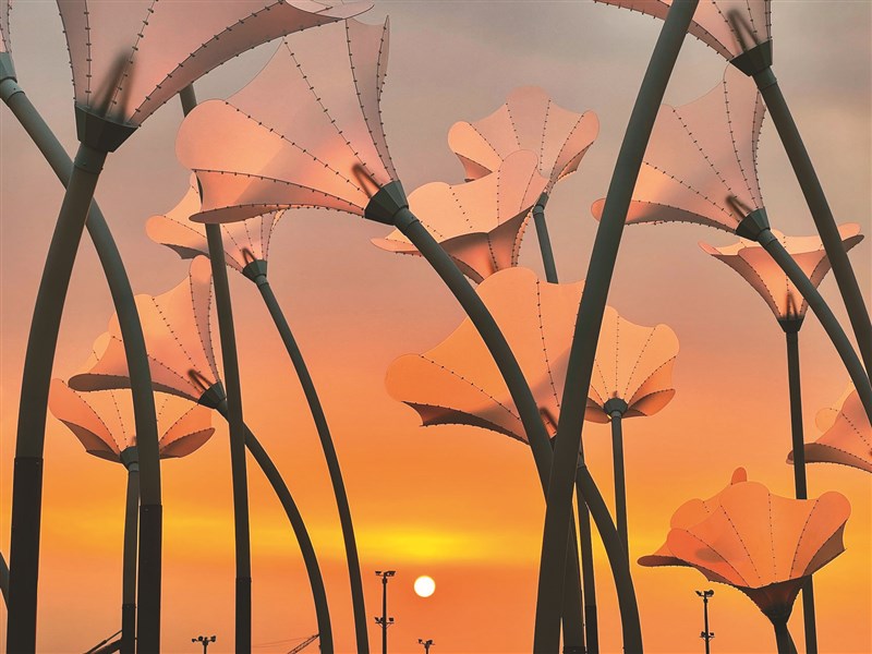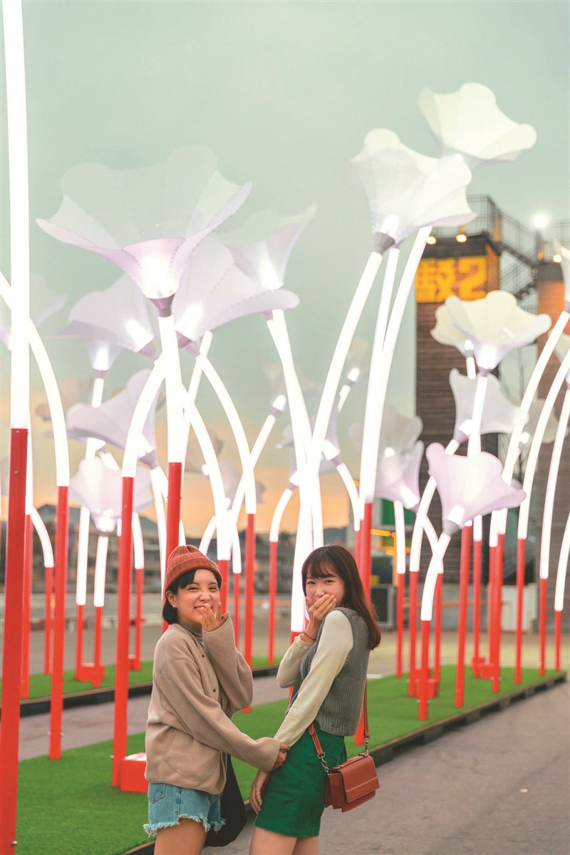 【記者曹麗蕙台北報導】「二○二二年台灣燈會在高雄」療癒新作,曾在二○一九繽紛雪梨燈光音樂節大放異彩的〈巨人的夢幻花園〉(Trumpet Flowers),昨天在高雄駁二藝術特區大港橋旁的淺三碼頭亮相。比人高出兩三倍的巨人花園,以奇幻繽紛燈光設計,吸引民眾駐足欣賞。