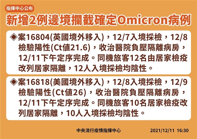 指揮中心醫療應變組副組長羅一鈞表示,案16804為本國籍30多歲女性, 自英國入境,曾接種2劑BNT疫苗,12月6日出現喉嚨乾,12月7日入境後直接採檢,12月8日確診陽性,Ct值21.6。